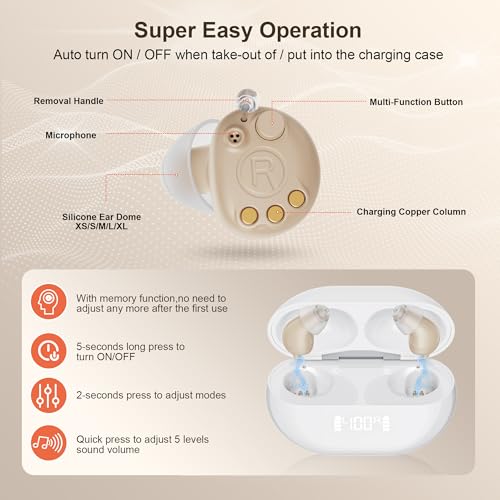 TWO MODES: One is normal mode, which can be used in most daily scenarios. The other is the noise reduction mode, which is suitable for public places or some noisy environments and can effectively eliminate background noise. So you can not only easily talk to friends and family, listen to TV conversations, but also attend noisy restaurants or concerts, etc. – hearing modes that only professional OTC hearing aids can provide. This hearing aid not only has an automatic on/off function, but also has a memory function, eliminating the need to readjust the mode and volume every time