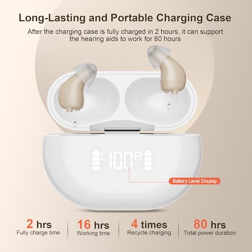 LONG BATTERY LIFE RECHARGEBLE: Our hearing aids offer unparalleled efficiency and longevity. After charging for 2 hours, you can get 16 hours of continuous use. In addition, the portable and compact charging box can charge the hearing aid 4 times when fully charged. All-day listening support to easily keep up with your activities