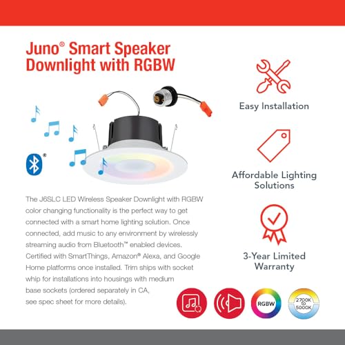 Juno 6 Inch Smart Recessed Light Speaker, Bluetooth, Alexa, Google Home Compatible, RGBW Speaker Downlight, Dynamic Color Red Green Blue White, Matte White (J6SLC RGBW MW M6)